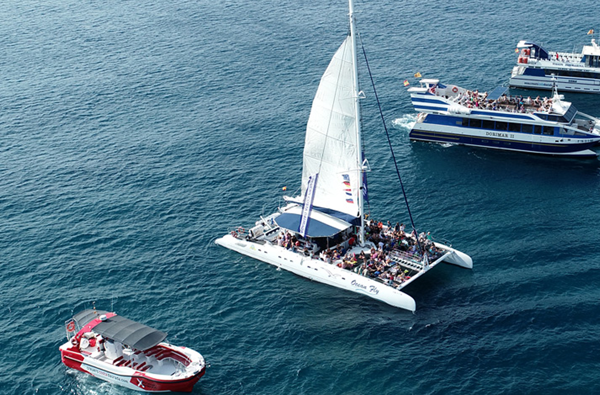 At Creuers Costa Daurada, we have four boats at your disposal—Ocean Fly, Dorimar, Blue Diamond, and Dorimar Experience—with superb services so you can follow any type of sporting event in style. Regattas are our specialty, and we've already found them to be a wonderful opportunity to enjoy an incredible event. Our fleet offers an excellent vantage point from which to observe the different boats and witness the competition unfold firsthand. Furthermore, all Creuers Costa Daurada boats can be customized for the occasion, allowing you to stand out from other spectators not only with their prime waterfront location but also with their distinctive branding. If there's an event you don't want to miss and want to see up close, don't hesitate!